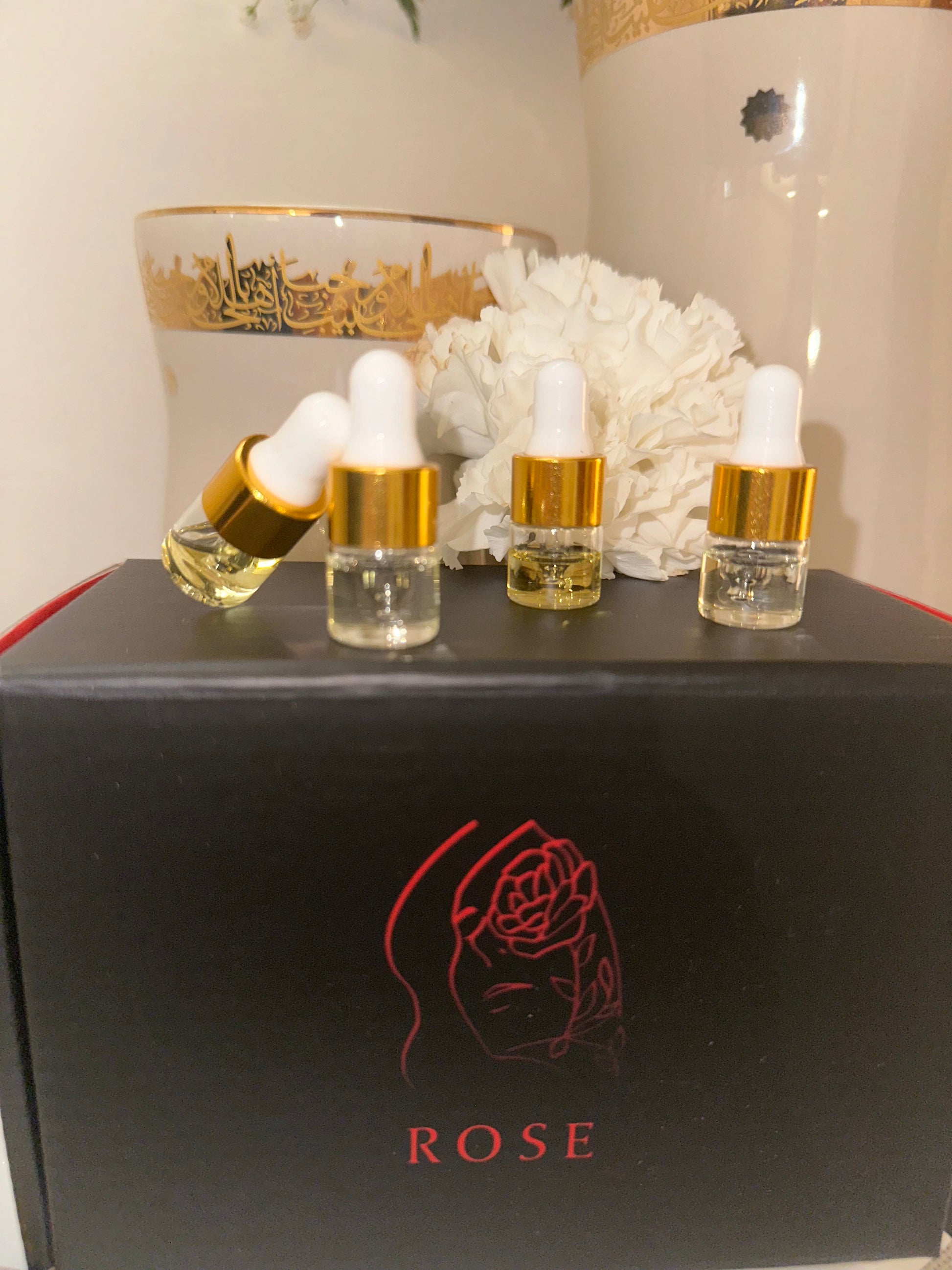 indulge in the elegance of ROSE Boutique 1 ML perfume oil collection, A curated selection Of four luxurious Scents , Designed To captivate your sense. Each fragrance is housed in sleek, 1 ML Glass barrow with the premium white and the gold dropper , ensuring Precise Application and long lasting wear . Perfect for on -the-go Use or As a sampler set, This collection embodies, sophistication and timeless beauty.